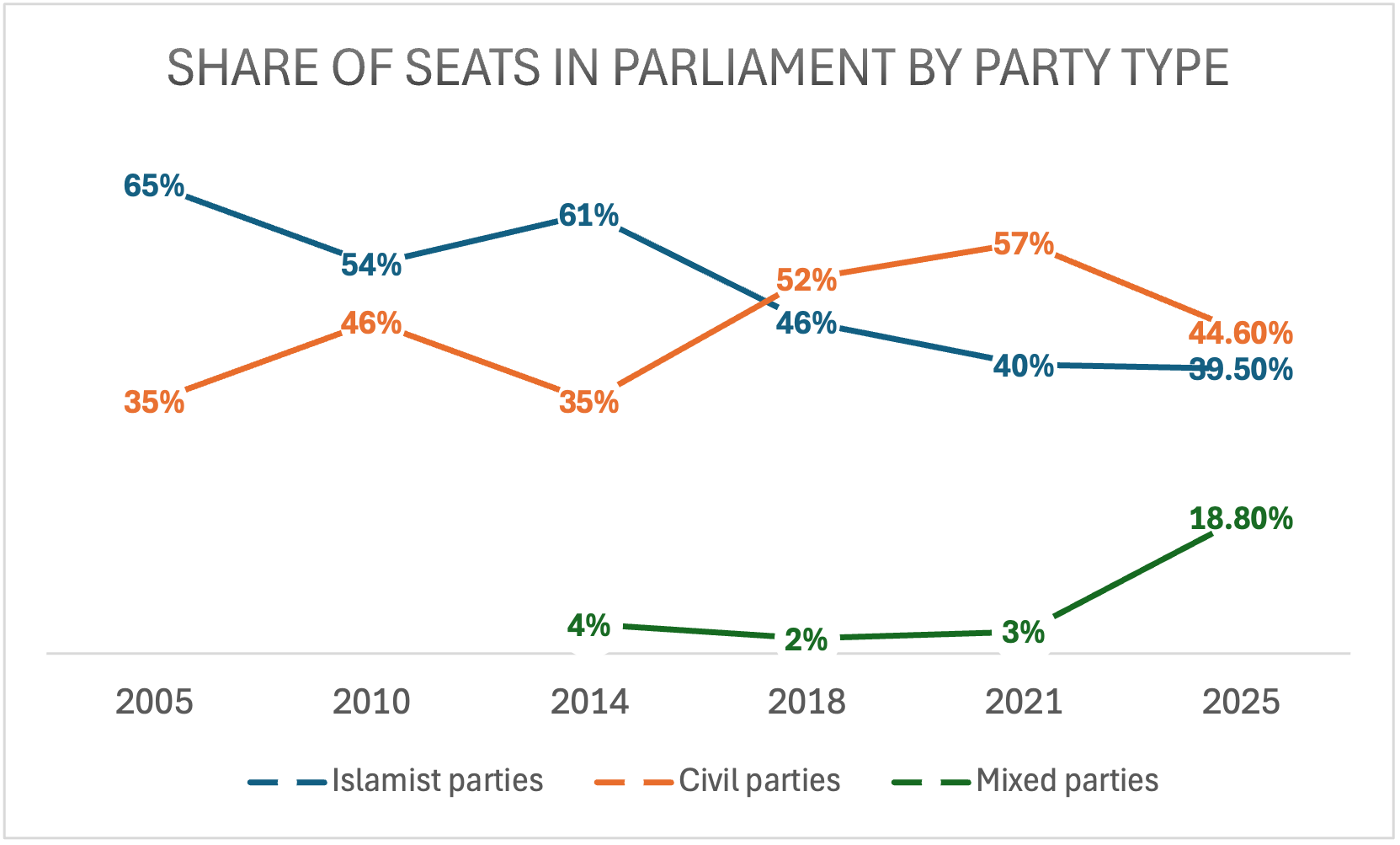 Nevertheless, the Iraqi voter turned against Islamist movements in the 2018 session after holding them responsible for the failures Iraq had suffered since 2003, when civil parties came to form a simple majority in parliament (52%). Continued frustration with the political system later manifested in the 2019 Tishreeni Uprising. This trend continued in the 2021 elections, a Purple Coup against the ruling political class. Then, civil movements achieved unprecedented success by capturing 57% of parliament seats, while Islamist groups held just 40%. This shift occurred despite most civil parties boycotting the elections while all political Islamist groups (Shia, Sunni, and Kurdish) participated.