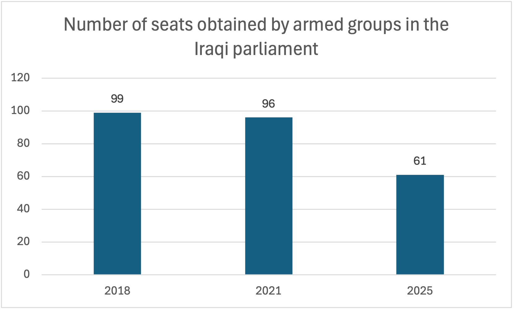 Armed groups have likewise achieved a larger share of seats relative to their voter base in this latest parliament. Despite the Iraqi constitution explicitly stating in its ninth article a rejection of establishing armed groups outside the state’s scope, as well as a prohibition of members of armed forces from running in elections in general, armed group participation has been present since the beginning. Badr Forces and the Mahdi Army participated in the first Iraqi elections held in 2005 within the United Iraqi Alliance list, winning first place and forming the government.