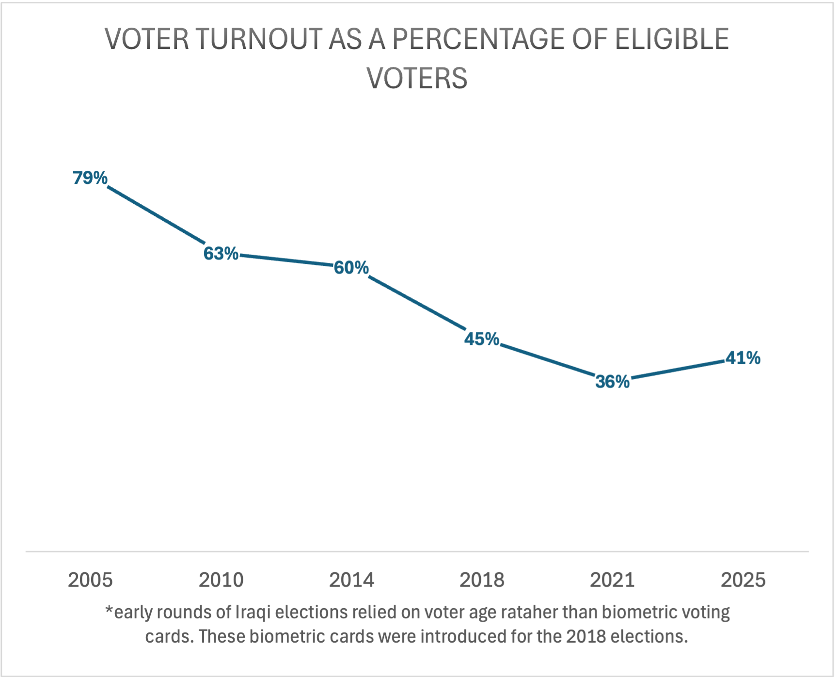 Thus, in spite of the increased turnout of "eligible voters" who possessed biometric cards, the 21.4 million voters in this election were paradoxically fewer than the over 22.1 million voters from the previous election in 2021. This decrease is all the more notable given significant population growth over the past four years, with over 4 million more Iraqis of voting age today. Accordingly, just 73% of Iraqi adults were "eligible voters" with biometric cards as compared to 88% in 2021. Thus, while the Iraqi High Electoral Commission announced a turnout rate of about 56% based on its definition of eligible voters, the electoral participation rate relative to the total number of Iraqis over 18 is just 41%.