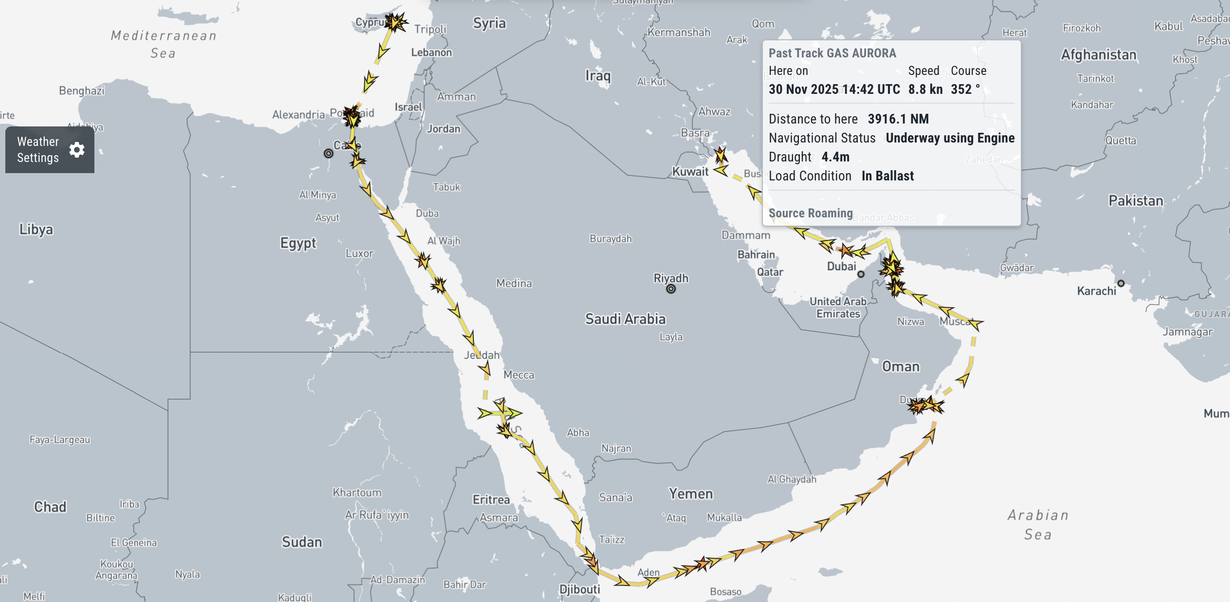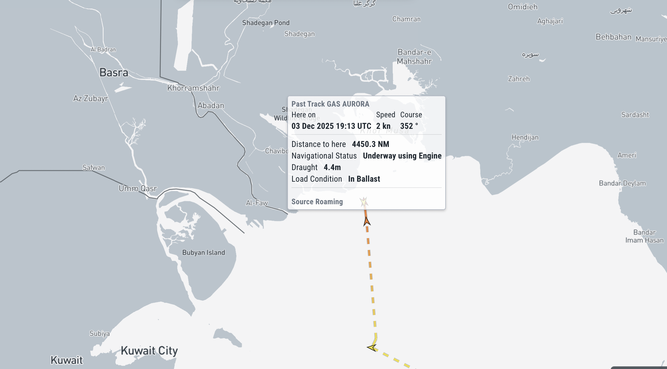 On November 30, 2025, the vessel sailed through the Strait of Hormuz, as indicated in the map below from MarineTraffic. Its navigation behavior on December 3 requires particular scrutiny, since the vessel was in a region where several ships have loaded Iranian oil and LPG cargoes clandestinely. The transmitted AIS data also shows that the Gas Aurora went to Iraq at one point during its voyage, but the reliability of this data could not be confirmed.
